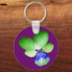 Esta chaveiro apresenta uma fotografia de uma flor de Pansy selvagem. A foto foi colorida artificialmente, resultando em um pansy com pétalas verdes brilhantes e um centro azul brilhante. O fundo é roxo para complementar as cores da flor.