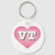 Esta cadeia-chave apresenta um coração cor-de-rosa com um centro lavado em branco que contém as letras maiúsculas, brancas e em negrito VT, a abreviatura oficial de Vermont, o estado verde da montanha.