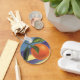 Ilustração de safra com fruta publicitária de arte com etiqueta apresentando um relaxamento de laranja orgânico e maduro em uma praia arenosa com algumas folhas lançando uma sombra. O oceano azul está à distância. Laranjas Juciosas nas férias de verão, longe do pomar na fazenda!
