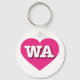 Este chaveiro apresenta um coração rosa-quente vibrante contendo as letras maiúsculas, brancas e em negrito, WA, a abreviação oficial para o estado de Washington, o estado verde.