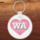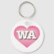 Este chaveiro apresenta um coração legal, cor-de-rosa com um centro lavado em branco contendo as letras maiúsculas, em negrito, branco, WA, a abreviação oficial para Washington, o estado verde-vivo.