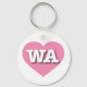 Este chaveiro apresenta um coração legal, cor-de-rosa contendo as letras maiúsculas, brancas, em negrito, WA, a abreviação oficial de Washington, o estado verde.