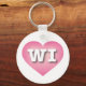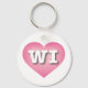 Este chaveiro apresenta um legal coração cor-de-rosa com um centro lavado em branco contendo as letras negrito, branca, maiúsculas WI, a abreviação oficial de Wisconsin, o estado do texugo.