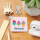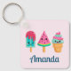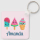 Um chaveiro com uma ilustração de 3 tratamentos de sorvete diferentes. Um picolé azul-esverdeado com gotas de morango e salpicadores coloridos. Um picolé de melancia. Um cone com camadas deliciosas de sorvete em rosa e menta. Todos com sorrisos kawaii fofos.