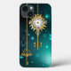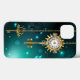 Chaves Douradas e antigas com engrenagens e marcadores penduram em correntes douradas sobre fundo verde luminoso.