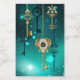 Chaves Douradas e antigas com engrenagens e marcadores penduram em correntes douradas sobre fundo verde luminoso.