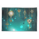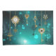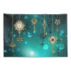 Chaves Douradas e antigas com engrenagens e marcadores penduram em correntes douradas sobre fundo verde luminoso.