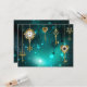 Chaves Douradas e antigas com engrenagens e marcadores penduram em correntes douradas sobre fundo verde luminoso.