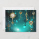 Chaves Douradas e antigas com engrenagens e marcadores penduram em correntes douradas sobre fundo verde luminoso.