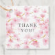 Etiqueta de favor do chá de fraldas floral com ramos de flor de cereja cor-de-rosa, colocados sobre fundo branco.
