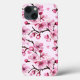 Uma ilustração bem detalhada das flores de cereja na floração do cheio, com delicadas pétalas cor-de-rosa com gradiente sutil e detalhes intrincados. As flores são acentuadas por botões vermelhos profundos e ramos castanhos esbranquiçados, criando um contraste natural e harmonioso. O fundo rosa suave melhora a estética suave e romântica