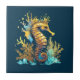 Um belo cavalo marinho 3D está na vertical na cauda e tem um homem azul e ouro. Ele está cercado por coral marinho nas mesmas cores que parecem brilhar e brilhar contra um fundo azul escuro. Este gráfico de conteúdo genérico e elegante é ideal para hotéis tropicais, costeiros, marinhos, da orla d'água ou ilhas, resorts, vilas, borras e penthouse, que querem adicionar um toque de estilo às suas paredes. Adequado a panelas de cozinha, banheiros ou apenas como um toque de sotaque a uma mesa,