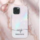 Below the iridescent shimmer, a delicate monogram (e.g., "mp") and your full name (e.g., "Melissa Parker") are displayed in a clean, modern script font. This case is the perfect accessory for anyone who loves Y2K nostalgia, modern glam, and personalized style.