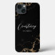 Caso Chic iPhone 13 com fundo de mármore preto e dourado e fontes elegantes de caligrafia para seu nome ou iniciais. O cobrir telefônico inclui espaço para adicionar seu nome ou monograma, e você pode até adicionar seu logotipo se usar esta capa de telefone para sua empresa. Este design de cobrir de iPhone preto profissional fará com que seu telefone pareça uma tendência extra.