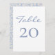 Estes cartões de número de tabela de casamento de chic e na moda apresentam um número de tabela personalizado e um conjunto de fontes de chic. O cartão da frente contém uma fonte azul empoeirada sobre um fundo branco, enquanto o verso do cartão tem um padrão floral azul e branco adorável. Dica: remova a marca d'água Zazzle na parte traseira da placa selecionando esta opção na página do produto. Este cartão faz parte de uma coleção que inclui convites e outros papéis de carta de casamento.