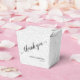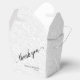 Elegante branco sobre um padrão de impressão de filigrana branca com seus nomes e obrigado você em letras de chic na frente, essas caixas de favoritos de festas de estilo especial são bonitas para favores de casamento, favores de chá de panela ou qualquer ocasião especial.