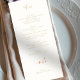 Elegante, fresco e moderno. Este belo e na moda, cardápio de casamento, apresenta uma flor selvagem puxada pela mão bonito e um conjunto contemporâneo de fontes em um ouro falso macio, contra um fundo de marfim leve. Variações deste design estão disponíveis na coleção.