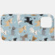 Cães chihuahua bonitos em preto, marrom, bronzeado, creme, cinza e casacos azuis sentam-se e ficam espalhados por ossos de cachorro e pegadas em um fundo azul claro.