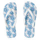 Chinelos para adultos perfeitos para toda a sua diversão de verão, mostrados aqui em branco com um impressão de flores azul e roxa colorido com tiras largas brancas e leito branco para pés. Personalize este item ou comprar como está.
