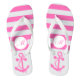 Chinelos temáticos náuticos cor-de-rosa quente. Os designs apresentam uma âncora rosa e um padrão listrado rosa e branco. No meio você pode personalizar com seu monograma.