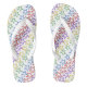 Os contornos das estrelas em amarelo, verde, azul, vermelho e roxo são multiplicados em linhas angulares na superfície da sandália. O arranjo dá o olhar inclinado para as estrelas, de modo que as cores se alinham em linhas específicas.