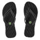 chinelos de monograma Bolinhas. Preto com bolinhas brancas pequenas e monograma redondo em verde e pêssego.