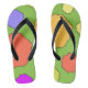 Estes chinelos coloridos vão iluminar seu verão! Eles são cheios de círculos laranja, amarelo e azul geométricos em forma de funk em um fundo verde.