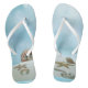 chinelos bonito de cena de praia, com gráficos de uma praia arenosa e conchas. Personalize para adicionar texto a este par tropical de chinelos de verão.