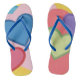 A pintura colorida de corações, colocada em camadas em tom mais claro ou mais escuro, é impressa em chinelos personalizados. O calçado da esquerda e da direita tem um aspecto único. Muito tendencioso.