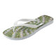 Braços brancos em espiral com centro verde e fundo, é uma imagem fotográfica de um filme circular trabalhado em crochê. A imagem está centrada em cada sandália.