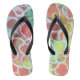 Os chinelos coloridos das mulheres, vermelho, verde, amarelo, laranja destacam as solas.