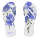 Chinelos florais personalizados com lindas flores azuis contra um fundo branco. Personalize o nome.