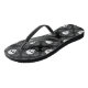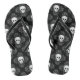 Chinelos góticos de mulheres bonitas com um padrão bonito no crânio do pé. Damas pretas e cinzas com crânios brancos com tiras pretas. Moda de verão gótica. Ou vestir no Halloween se estiver quente onde você está naquela época do ano. Eu acho que eles ficariam bonitos com unhas de dedos polido preto e uma pulseira de tornozelo. Excelente para o Halloween também em climas mais quentes.