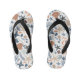 Chinelos de verão cor d'água coloridas, com padrão de conchas, corais e estrelas-do-mar, em tons azuis e laranja.