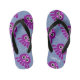 Chinelos de crianças personalizadas com um padrão de polvo roxo feliz em fundo azul pontilhado com bolhas.