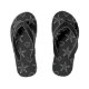 Estirpes brancas e padrão de concha em fundo preto. Sandálias de sacudir personalizadas. Ideia de presente para adultos e crianças que amam o mar e a vida marinha.