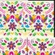 Um padrão perfeito com um estilo mexicano de bordado Otomi, com pássaros coloridos, flores e folhas sobre fundo leve. Os pássaros se enfrentam, com suas asas espalhadas e caudas apontando para baixo. As flores são dispostas em um padrão simétrico, com as aves no centro. As folhas estão espalhadas pelas flores e pelos pássaros, somando-se à vibração geral do design. A paleta de cores é brilhante e alegre, com uma mistura de cores primárias e secundárias. O estilo lembra a tradicional arte popular mexicana, com uma reviravolta moderna. O efeito geral é lúdico e festivo.