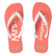 Coral brilhante com a Sra. e Sobrenome escrito em branco e data do casamento em azul-turquesa. Bonito destino de praia ou chinelos de lua de mel para a nova noiva. Designs originais por TamiraZDesign.