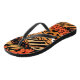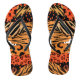 Chinelos pretos com uma impressão animal selvagem em laranja, castanho e preto, estes são o perfeito acessório único para vestir sua roupa para qualquer ocasião.
