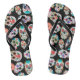 Imagens brilhantes de crânios de açúcar fazem um padrão colorido nesses chinelos divertidos. Há várias imagens diferentes do crânio, todas individuais em várias cores, junto com um padrão de estilo boho cobra. As imagens são colocadas sobre um fundo preto.