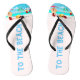 Imagem de três pimentões de pimenta vermelha em um banho de sol em uma praia e nadando no mar e um texto Para a praia. Chinelos engraçados para qualquer um. Personalizável, você pode alterar a imagem, alterar ou excluir o texto e alterar a cor do plano de fundo. Divirta-se e faça um.