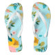 Um par de flip-flops coloridos adornada com padrões florais sobre um fundo azul brilhante.