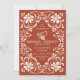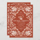 O convite para o casamento apresenta uma trabalho de arte de aquarela de um quadro floral branco e um coração romântico simbolizando o amor eterno e um forte vínculo que resiste aos julgamentos do tempo. O fundo é uma cor vermelha quente e suja. Ele é facilmente personalizável e inclui uma área de placa de detalhes que pode ser preenchida e um código de QR digitalizável no verso. Perfeito para uma elegante safra ou uma queda ou casamento no inverno moderna do estilo boêmico, bem como casamentos em qualquer outra época.