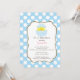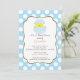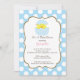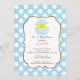 Um convite doce do chá de fraldas do menino do pintinho da páscoa que caracteriza um pintinho bonito do bebê ajustou-se em um fundo azul e branco das bolinhas.  Aperfeiçoe para um chá de fraldas do bebé do tempo da páscoa.  Produtos de harmonização também disponíveis em nossa loja em www.celebrateitinvites.com.  ©Zenware