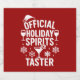 Quote: Official Holiday Spirits Taster. Red background, white text. Decorated with glasses of wine, Santa's hat, coctail glass and snow crystals,