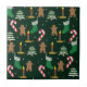 Festive Christmas pattern with gingerbread men, candy canes, festive candles, and green snow-capped Christmas trees.