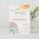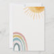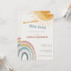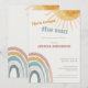 Um convite de chuva de bebê “Aqui Vem o Sol” caloroso e alegre com um design suave de arco-íris e sol, perfeito para celebrar um raio de solzinho.
