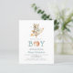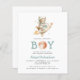 Este convite de chuva de bebê apresenta um astronauta urso de pelúcia aquarela pilotando um foguete acima das palavras "Houston temos um MENINO," com um planeta aquarela substituindo o "O" em "MENINO". Personalize o texto com o nome da futura mamãe em azul-verde e os detalhes em fonte sans serif cinza carvão.