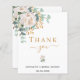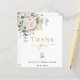 Um cartão de agradecimento de casamento moderno e elegante. Um fundo branco chic. Decorado com uma flor branca, flor (peônia) e folhas de eucalipto pintadas com água, raminhos, folhagens e um ramo de ouro falso. Letras pretas e douradas. Na frente o texto: Obrigado, nome e data. Verso: Modelo para o seu bilhete de agradecimento e nome.