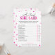 Este jogo de bingo moderno apresenta um fundo magenta rosa com confetes metálicos. O texto é escrito em uma mistura de uma fonte de caligrafia divertida e uma fonte serifada moderna, este cartão é personalizado com o nome da Noiva e a data do Chá de Panela.